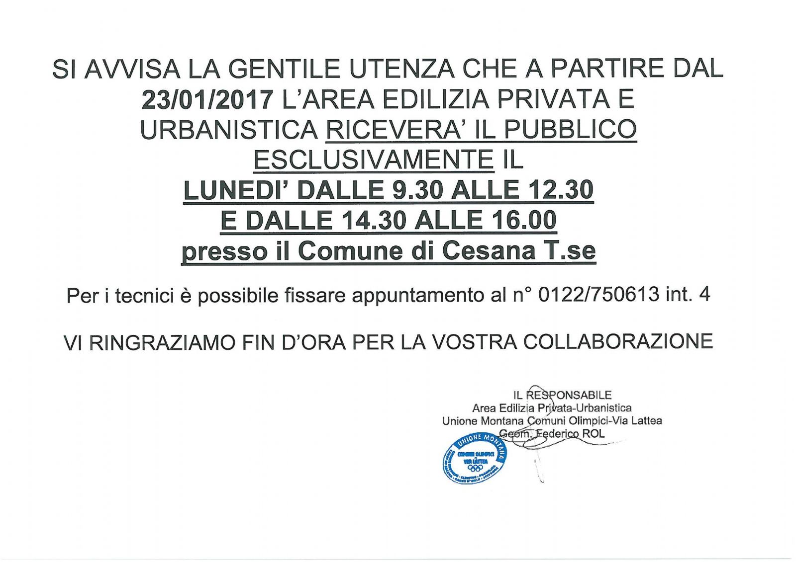 Si comunica alla gentile utenza che a partire dal 23/01/2017 L'Area Edilizia Privata e Urbanistica riceverà al pubblico esclusivamente LUNEDI' dalle 9.30 - 12.30 14.30/16.00 presso il Comune di Cesana T.se.