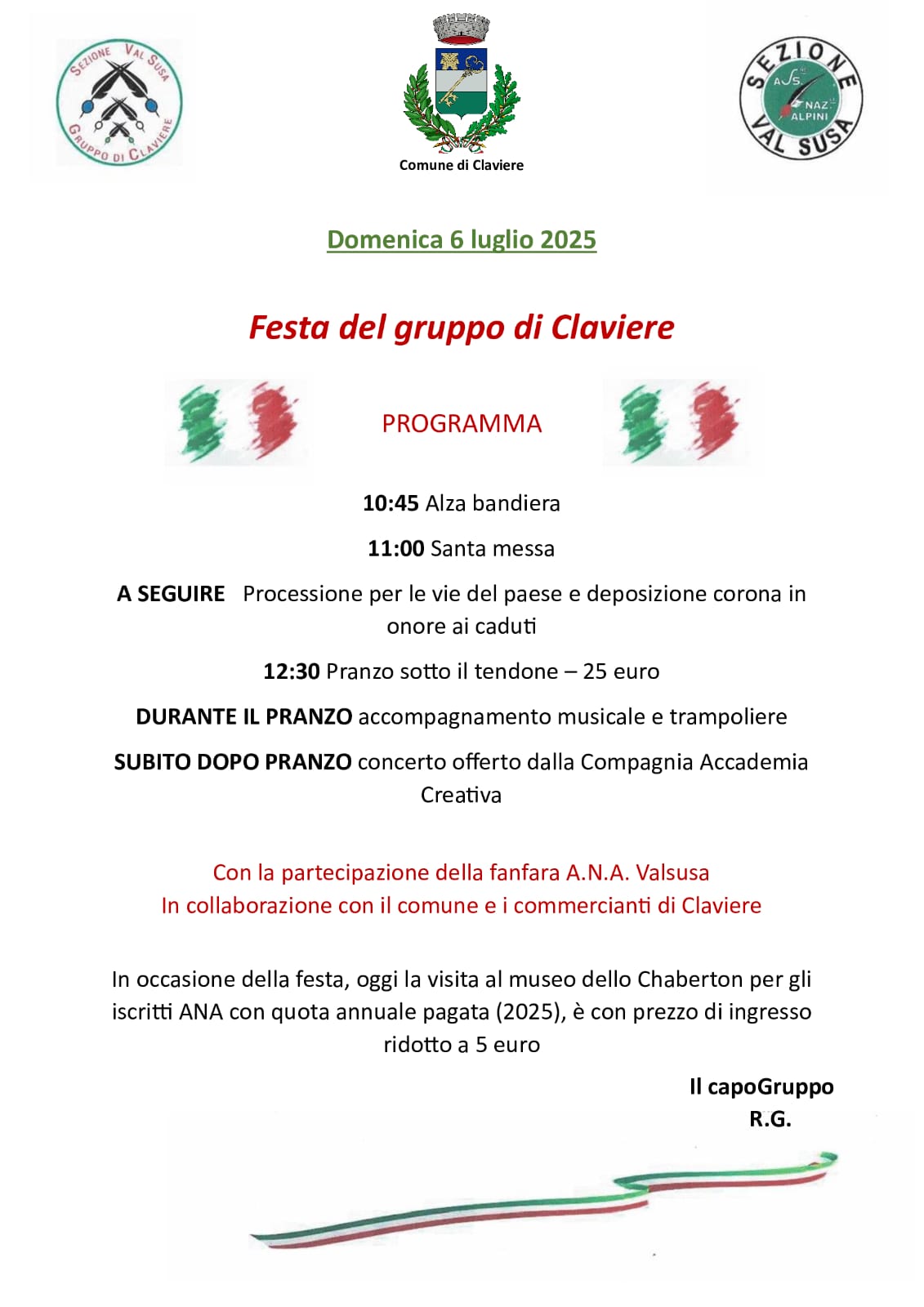 A seguire piccolo aperitivo a cura dell'Associazione nazionale Alpini gruppo di Claviere.